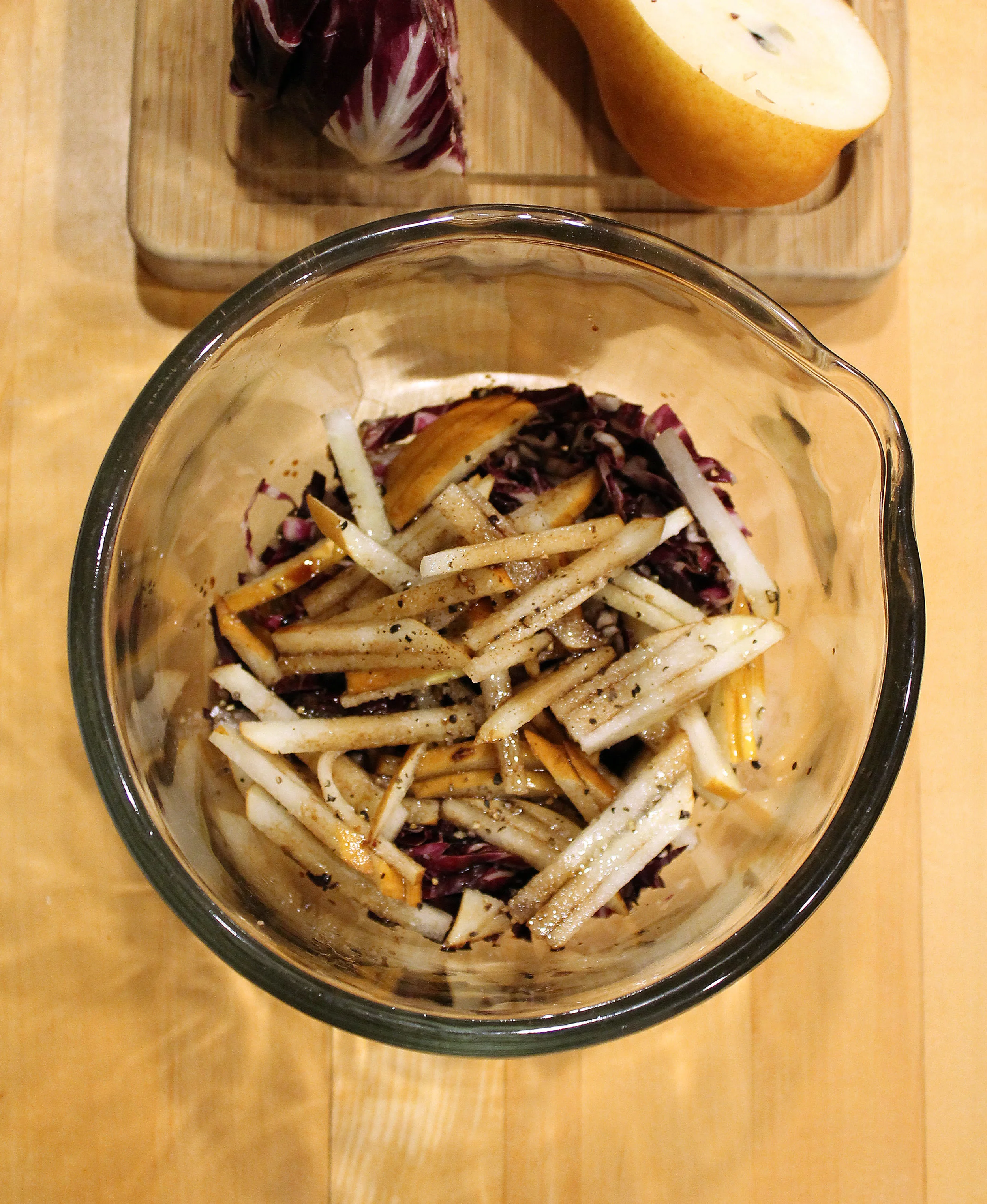 It may not be the most trendy or cutting edge, but Williams Sonoma's Salad of the Day cookbook is an old standby. I've had it for several years and it is actually one of my more frequently used volumes. Any time I find myself lacking salad inspiration I can crack it open, flip to today's date, and find an interesting salad made with seasonal ingredients. I often flip through the nearby days to find one that grabs my eye. I also really love their Healthy Dish of the Day book for the same reason. Both are approachable and eternally useful in providing a seemingly endless supply of exciting new dinner ideas. ANYway. So I was looking through Salad of the Day as per usual and this radicchio and pear salad caught my eye. Mostly because I realized that I had both pear and radicchio in my refrigerator. And also I was hungry.