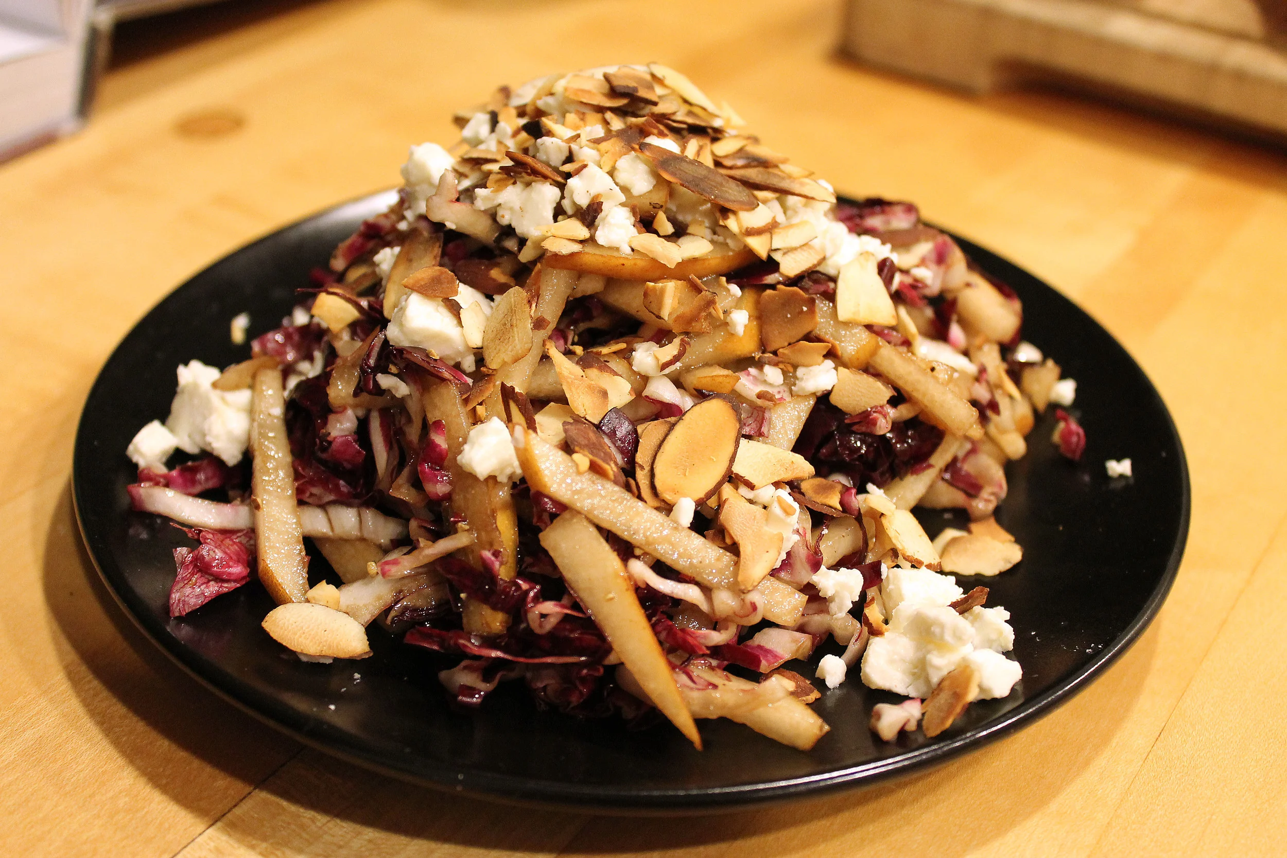 Throw radicchio and pear in a small mixing bowl. Drizzle/slug oil and vinegar over top, then season with salt and pepper to taste. Mix it up a bit. Transfer mixture to salad plate or other receptacle. Top with desired amount of cheese (recommendation: hella) and top it all off with toasted nuts. Take a trillion pics with your phone, then eat the salad as you decide which one to post on Instagram.