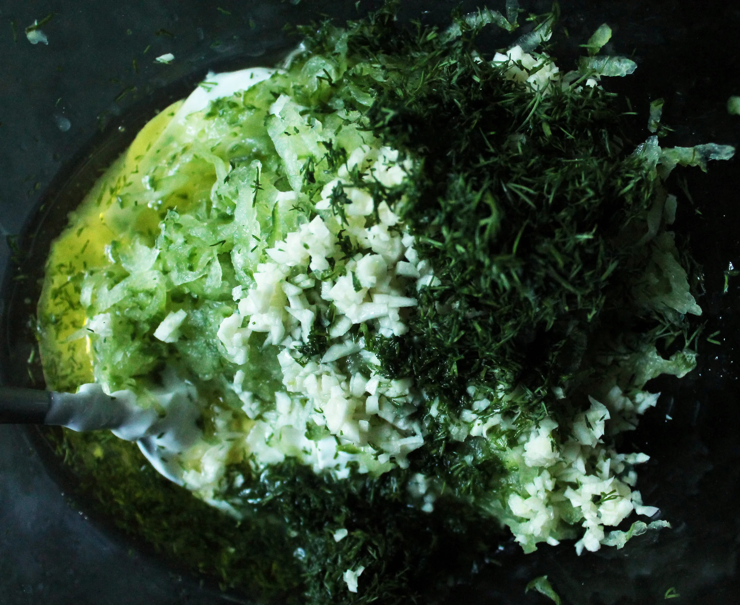 Grate the cucumber into a strainer (preferably lined with cheesecloth, but not mandatory) over a bowl. Let sit for a few minutes. Meanwhile, put the yogurt in a mixing bowl. After the cucumber has drained a bit, squeeze out as much liquid as you can (the cheesecloth helps with this), and add the squeezed cuke to the yogurt. Add the olive oil, garlic, dill, and lemon juice, stir to combine. Season with salt and pepper, stir, taste, and adjust seasoning if needed. You can always add more dill- in my experience there's no such thing as too much here!