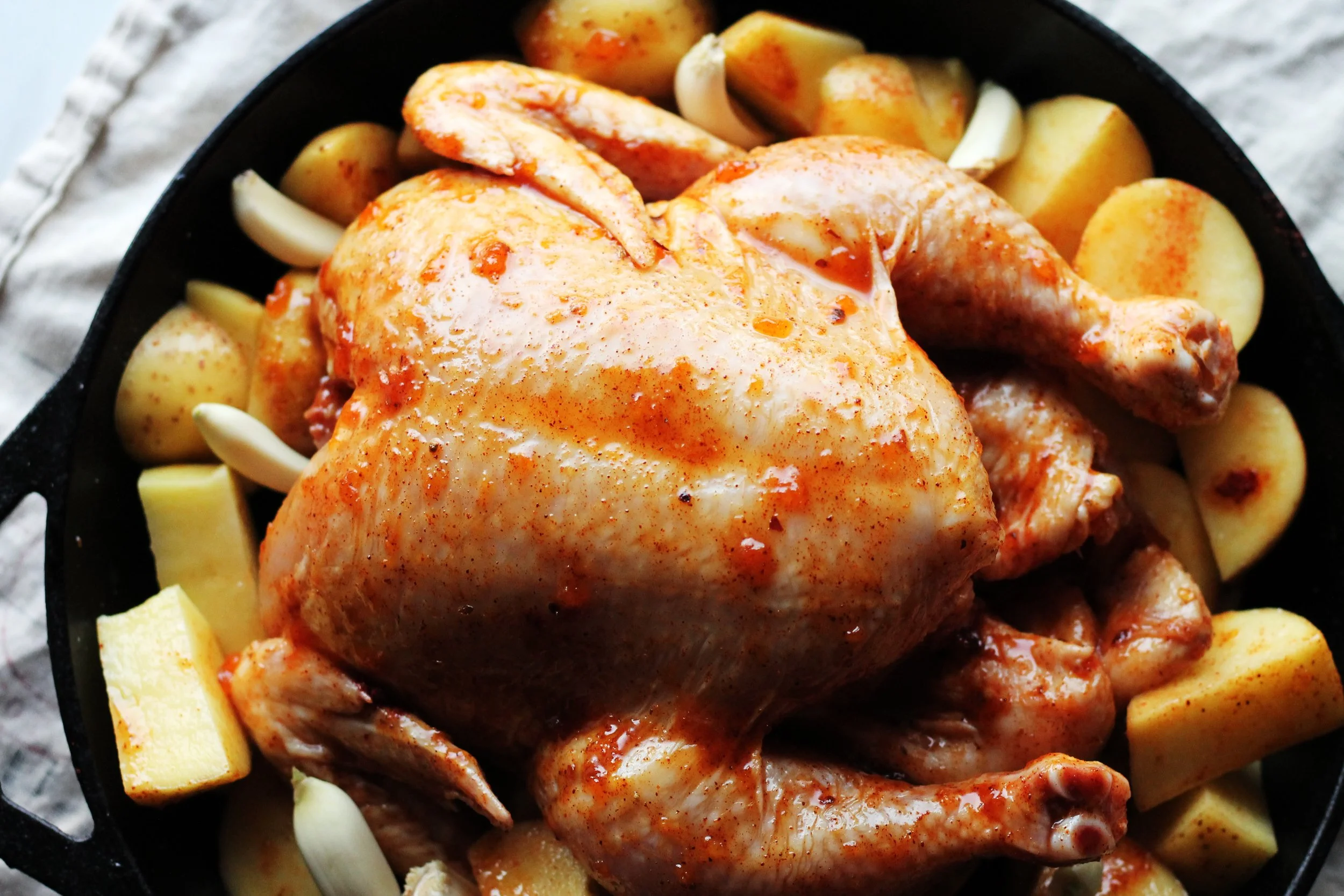 Preheat oven to 350F. Mix the jam, soy sauce, garlic, oil, salt, and spices in a small bowl. Place the chicken in a large oven proof pan. Brush the marinade generously all over the chicken, making sure it’s coated on all sides. You can also use your hands for this (feel free to wear gloves!) and really get in there! Feel free to get that marinade under the skin and up in the cavity.