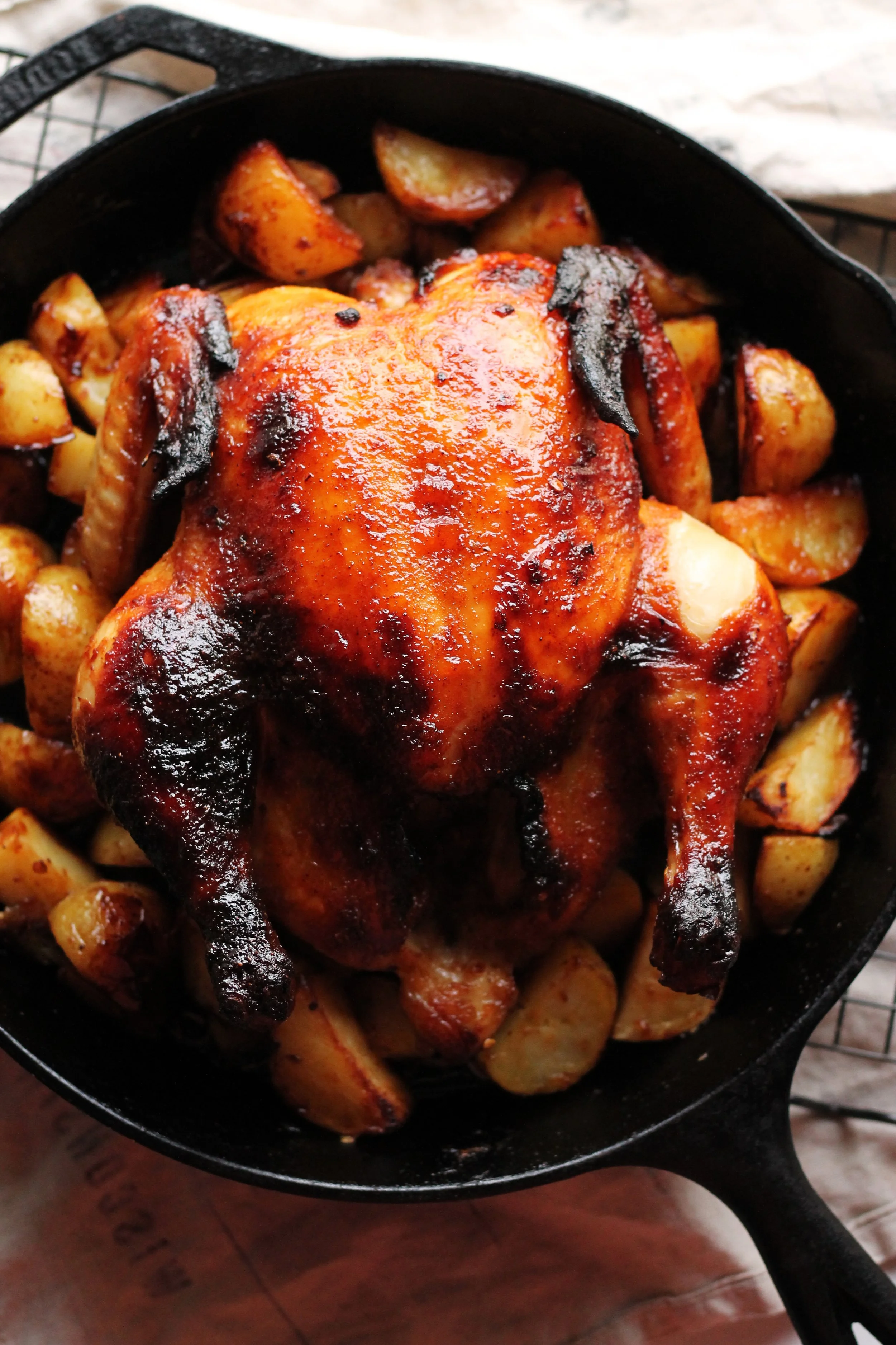 Put the chicken and potatoes in the oven and roast for about 1 hour 20 minutes. Check on the bird every 20 minutes or so during cook time, rotating the pan and mixing potatoes each time. If the chicken skin is getting too dark before it is cooked through, cover with foil to prevent further browning. You can remove the foil 5-10 minutes before taking the bird from the oven; if the skin is blackened here and there that’s alright!