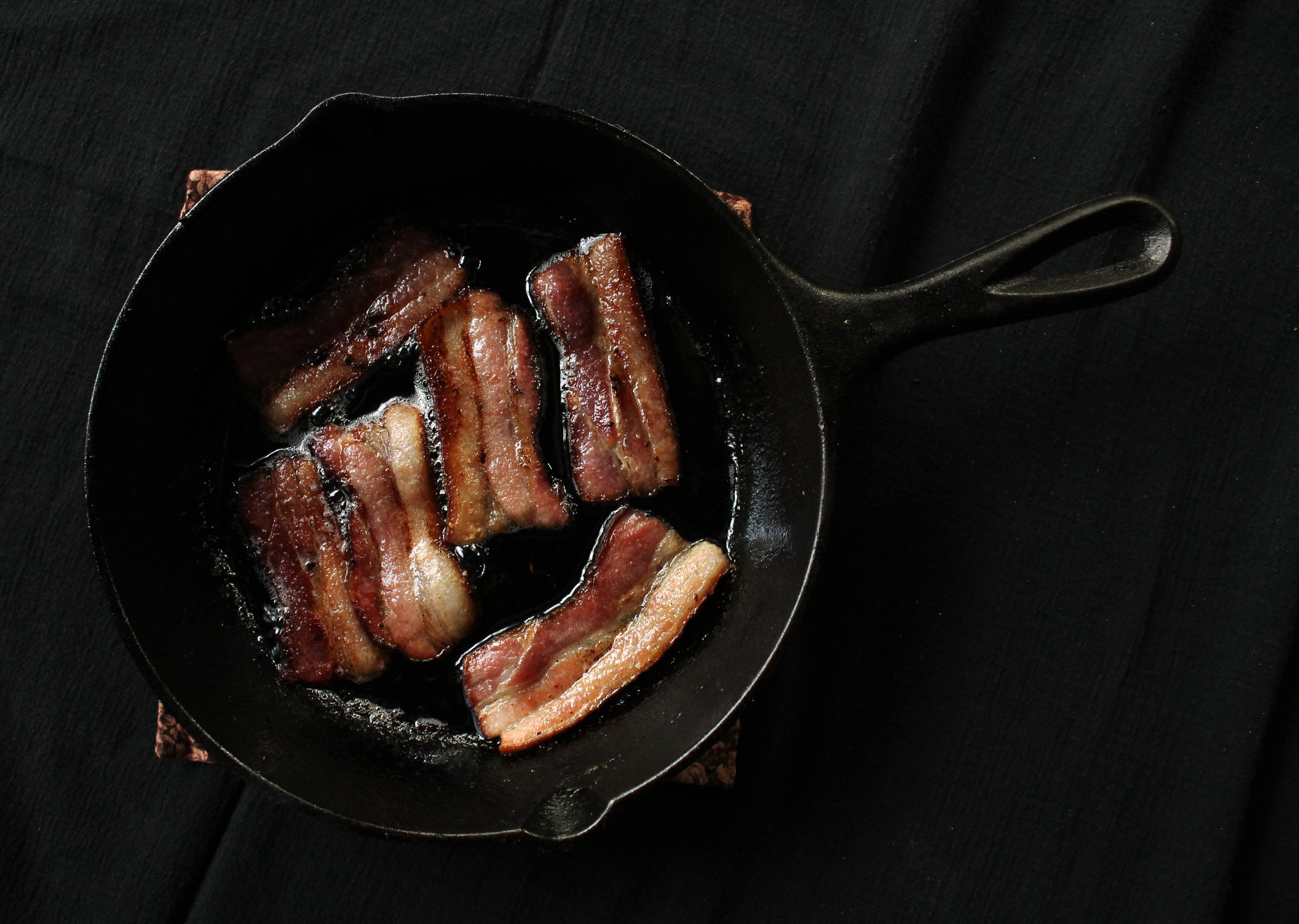 Meanwhile, start the bacon. I like to cook it up in my small (6”) cast iron pan, but any heavy bottomed pan will do. Cut the strips of bacon in half crosswise, and plop them in your pan over medium high heat. Cook, turning occasionally, until desired doneness. They will continue to crisp up a bit after being removed from the pan. When the bacon is looking good to you, remove to a paper towel lined plate. Set aside. Leave the precious bacon fat in the pan! Tear (don't cut- torn edges make for delicious crispiness) the bread into bite sized-ish chunks and toss into the pan with the bacon drippings. Keep the heat around medium/medium high- use your judgement here, you want it to be sizzling but not burning. Cook the croutons, stirring every minute or so, until they are crispy and crouton-y. Turn off heat, leave in pan until ready to serve.