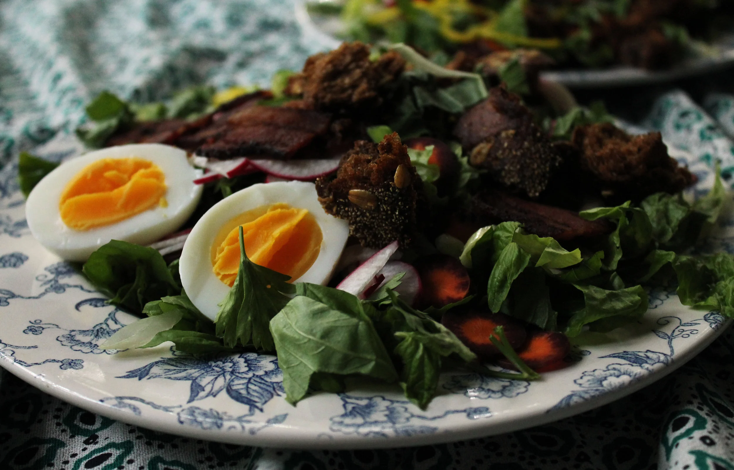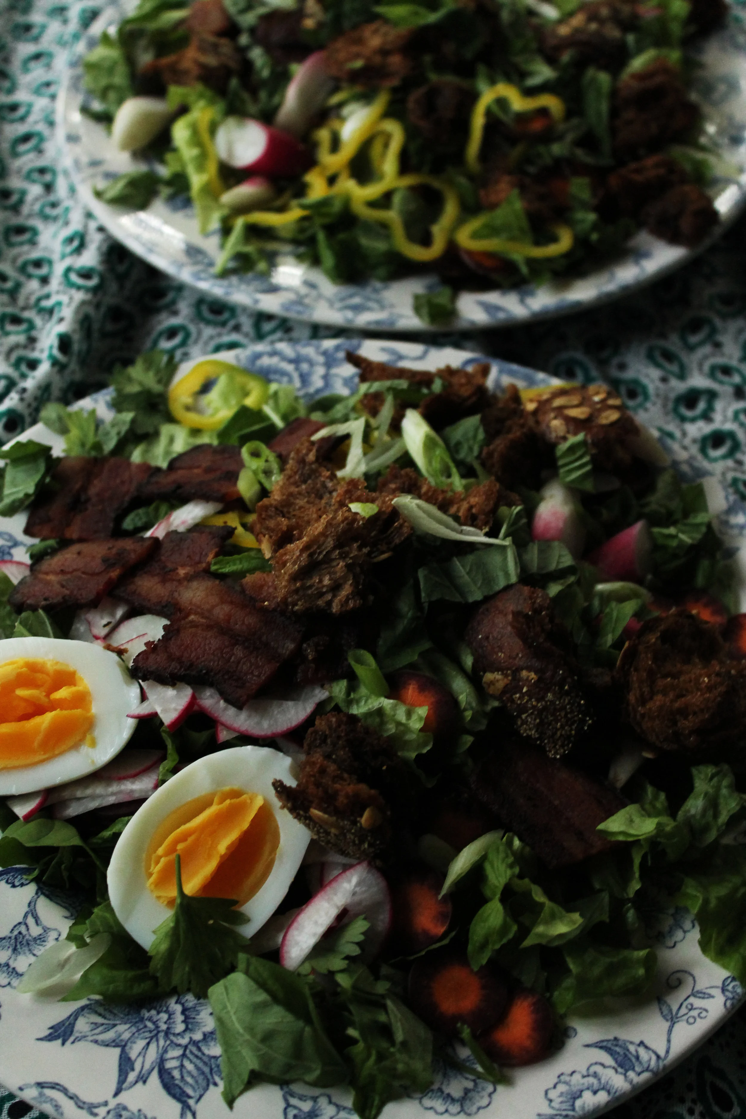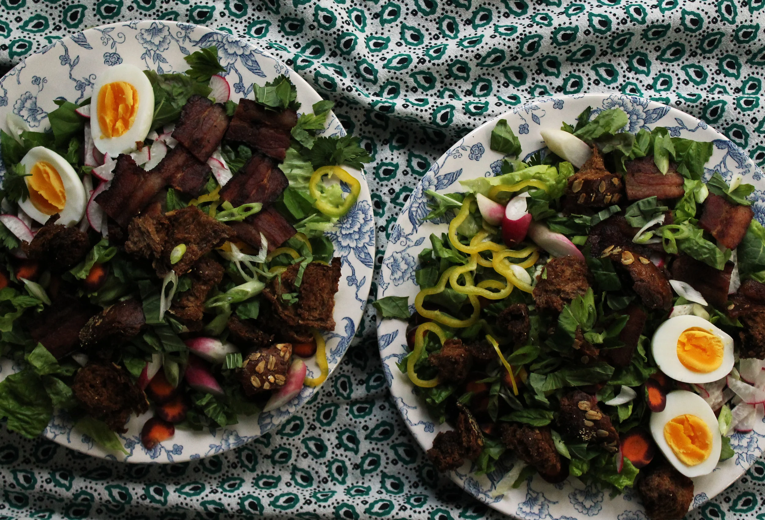 To assemble the salad: prep your salad greens. Wash, cut if needed, etc. Pile a healthy amount of greens on two plates. Add veggies: I like thinly sliced carrot and sweet pepper (I use my mandolin for these, if you don't have one I strongly recommend you get one! Otherwise a sharp knife will do the trick), and a mix of thinly sliced radish and larger radish chunks. Feel free to adjust to your taste- if you hate peppers but love cucumbers, by all means switch it up. Cherry tomatoes and avocado would be lovely here as well. Whatever your veg preference, arrange desired vegetables on top of greens. Peel eggs and slice in half lengthwise. Add 1-2 eggs to each plate (as desired). Divide bacon between plates, breaking into bite sized pieces. Top with croutons and plenty of fresh herbs. I like to use kitchen scissors for this, cutting the herbs directly over the plate. Do the same with the green onions, using scissors to cut on the diagonal onto each plate.