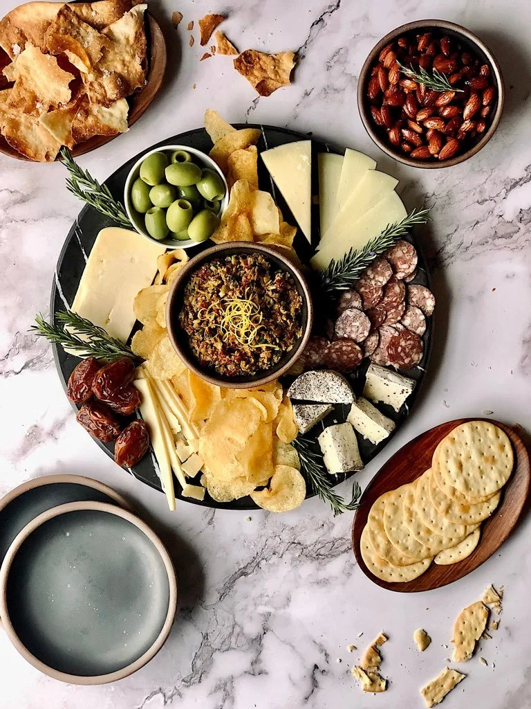 ”For a classic #nibbleboard I always try to include something salty, something crunchy, something briny, something sweet like a dried fruit or fresh fruit, a couple kinds of cheeses with different profiles and textures, something to dip and crackers or a torn baguette and salami. Try to go with at least one or two homemade components if time permits. David’s must haves: salami, olives, a couple kinds of cheeses, chips, nuts.