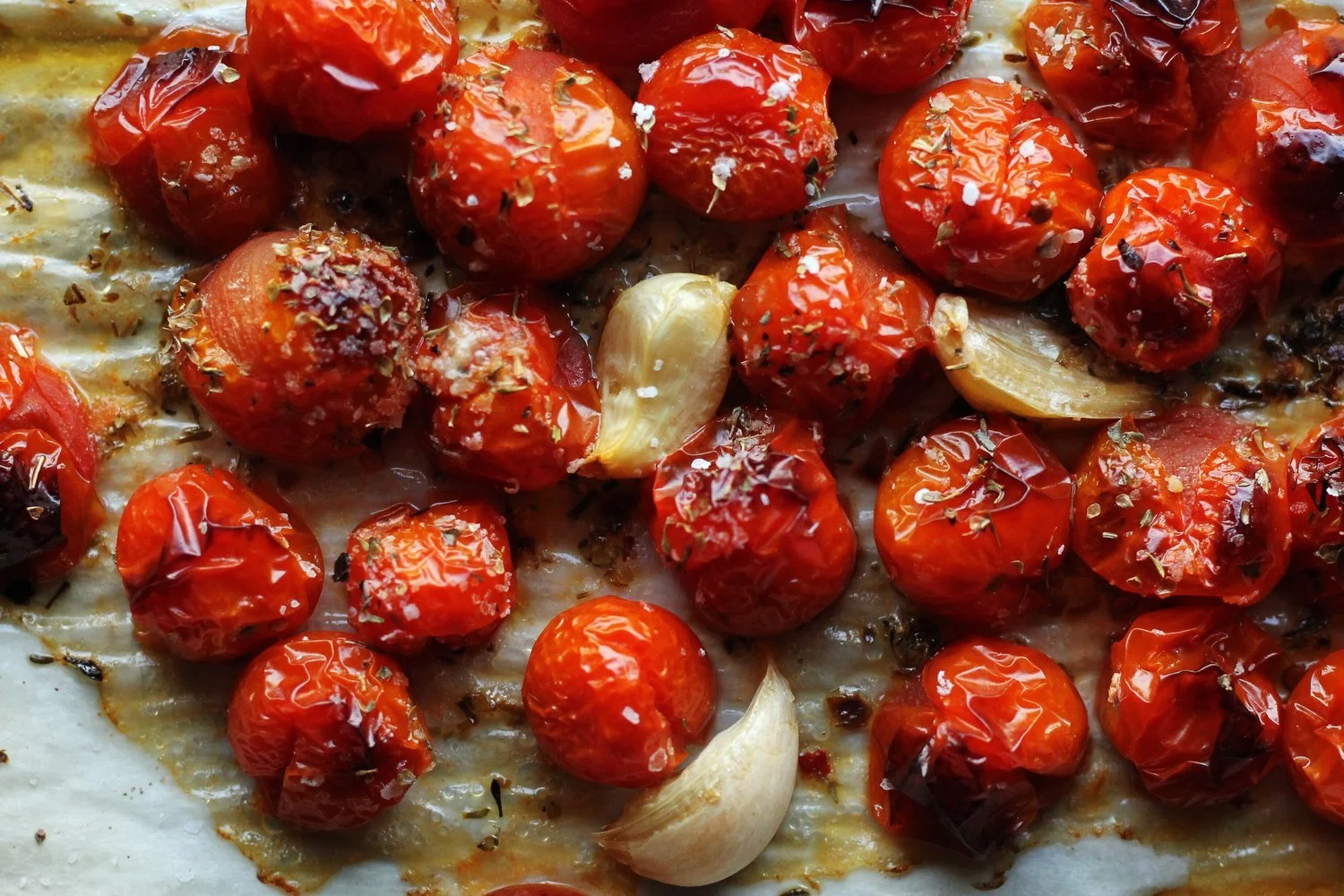 Preheat oven to 375F. Place tomatoes and unpeeled garlic cloves on a sheet pan. Drizzle with olive oil and sprinkle oregano over top along with ½ tsp salt and ¼ tsp red pepper flakes. Roast for about 30 minutes, until tomatoes are splitting, blistered, and slightly charred.