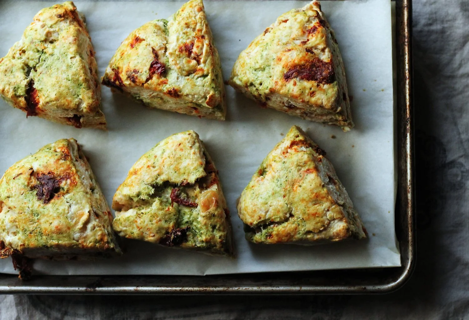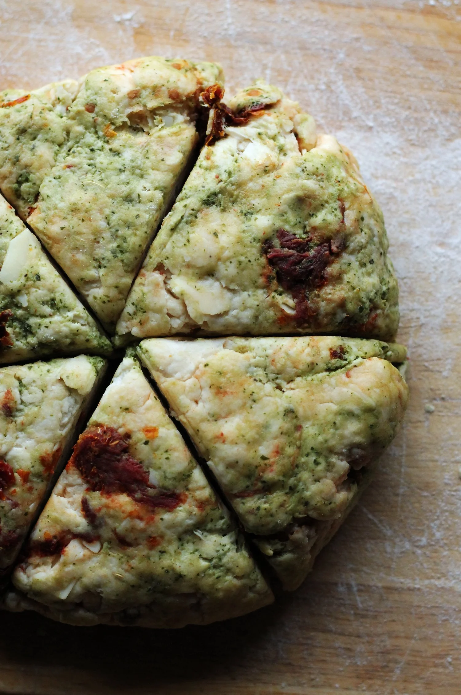Preheat oven to 425F. Mix flour, baking powder, and salt in a large mixing bowl. Cut the cold butter into cubes and add to the flour mixture. Working briskly, scrunch the butter through the flour vigorously with your hands. You basically want to smash the chunks of butter into the flour mixture with your fingers. When all the large chunks of butter are smashed and the mixture is crumbly, you are done. Some medium sized chunks of butter may remain, this is just fine and will only make the scones flakier! Add the fennel seeds and cheese and mix to combine. Add ½ cup of milk and knead dough into a ball. Add more milk as needed until the dough comes together. Add sun-dried tomatoes and fold into the dough to mix. Add pesto and gently fold it through the dough once or twice; don’t over mix!