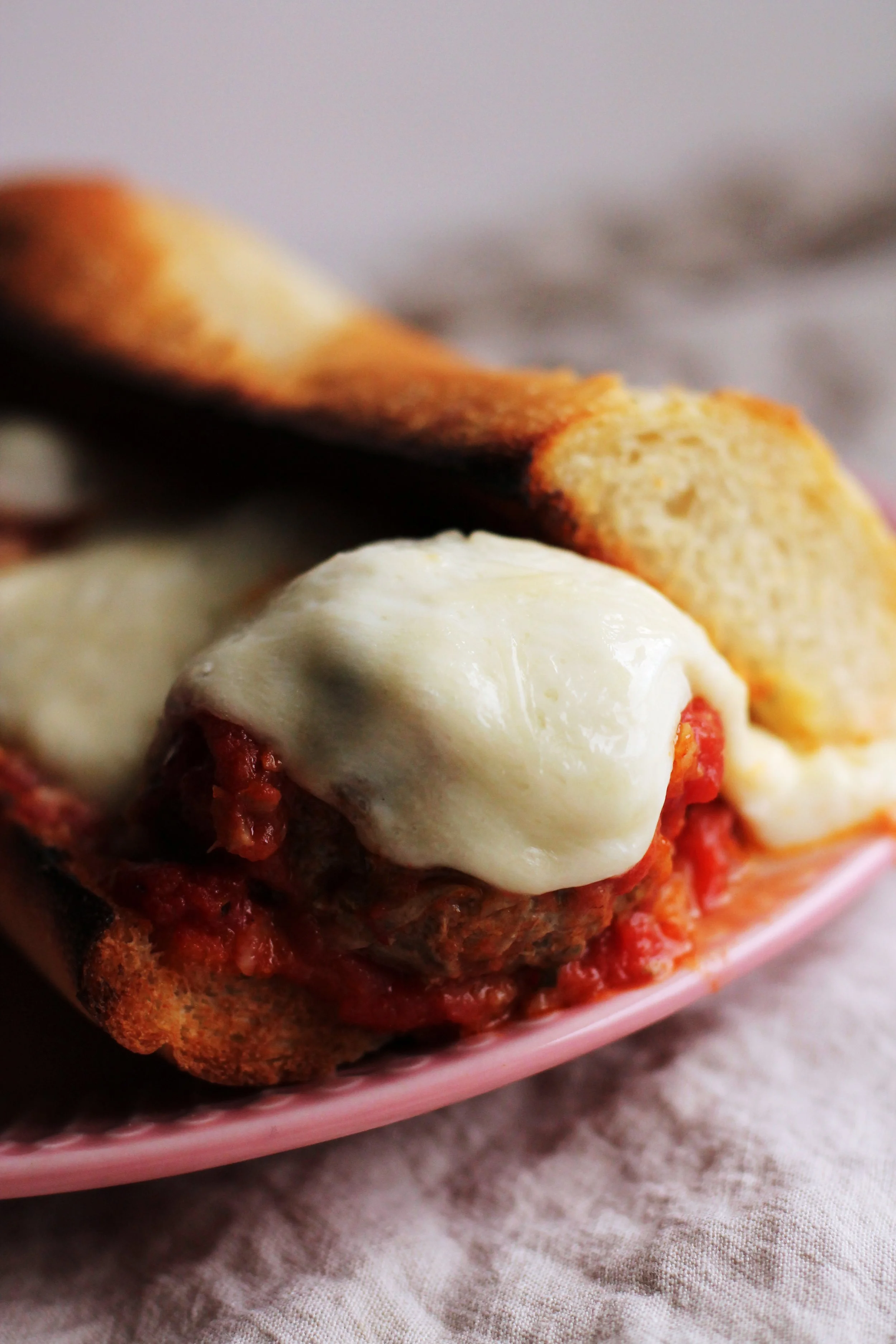 Add the meatballs to the sauce over medium low heat. If you have made the components ahead, reheat in a saucepan, stirring occasionally, until the meatballs are heated through. Split two hoagies or 8in lengths of baguette. [Optional: Brush the inside of the rolls with olive oil or garlic butter and place each in a pan, buttered side down, and toast over medium heat for a few minutes until golden brown (unless your pan is very large you may need to do this one at a time.] Line a sheet pan with foil or parchment paper and place the bread on it, open sides up. Load each roll up with half the meatballs and plenty of tomato sauce. Place the sliced mozzarella on top and put the pan under the broiler for 3-4 minutes. Keep an eye on things and if the edges of bread are getting too dark and the cheese isn’t melty enough yet cover the edges with a little foil. Remove the pan from the oven when everything is all melty. Enjoy your delicious messy sandwich in the back of a cop car, dripping as much sauce as you can. Alternatively, wrap each sandwich tightly in parchment paper and cut in half for a more manageable eating experience.