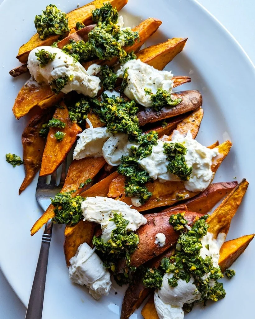 When the sweet potatoes are done, remove from oven and transfer to a large platter. Break the burrata overtop, scattering large chunks over the wedges. Dollop the green sauce liberally overtop. Pass an extra sauce at the table. Serve immediately.