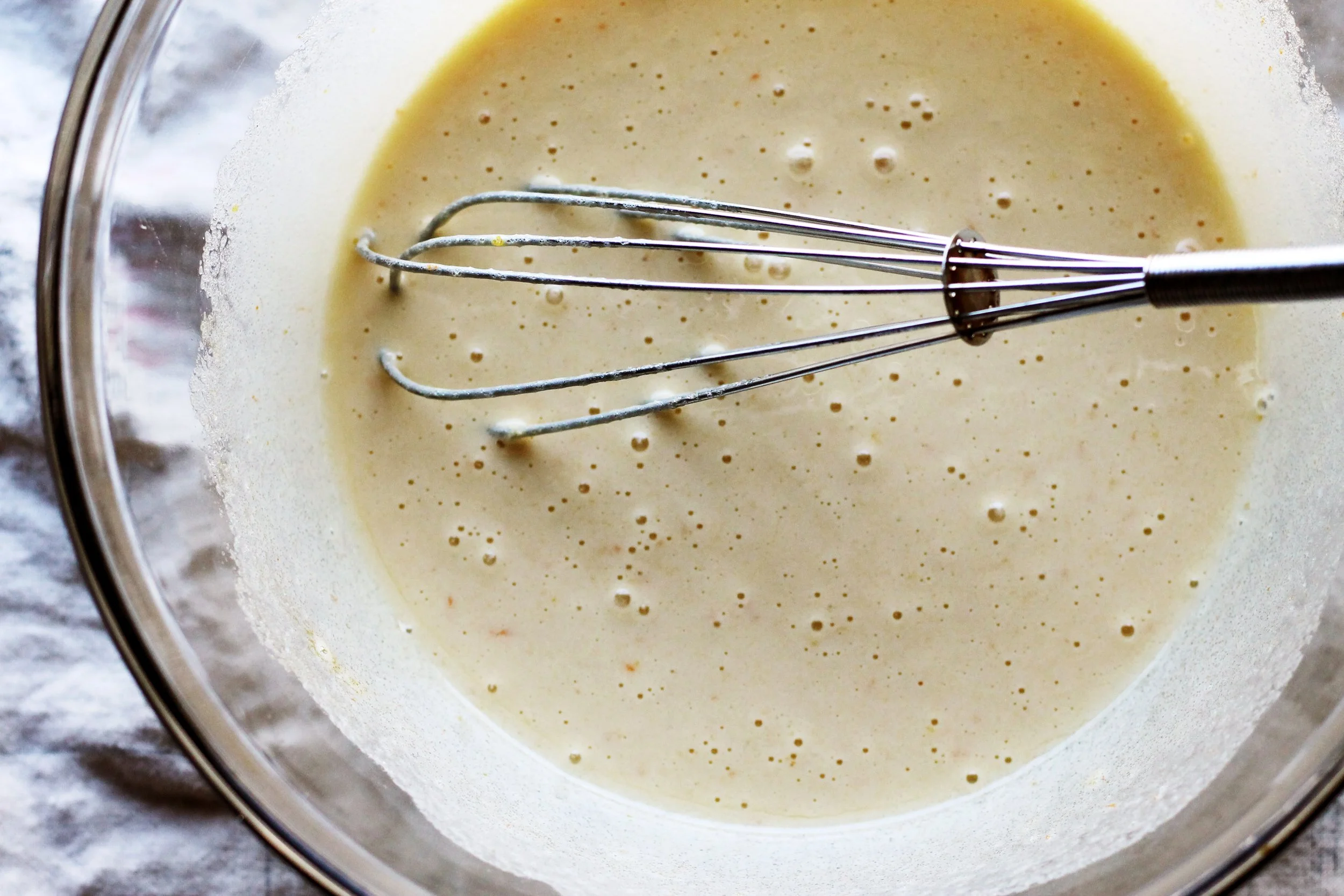 In a large bowl, whisk together the sugar, eggs, vanilla and orange zest. Whisk hard until the mixture is foamy and aerated– when you think it’s done, give it another couple minutes of elbow grease! (You can also use a stand mixture for this if you feel so inclined) Drizzle the chocolate mixture in bit by bit, whisking vigorously in between additions (you don’t want the hot chocolate mixture to cook the eggs).