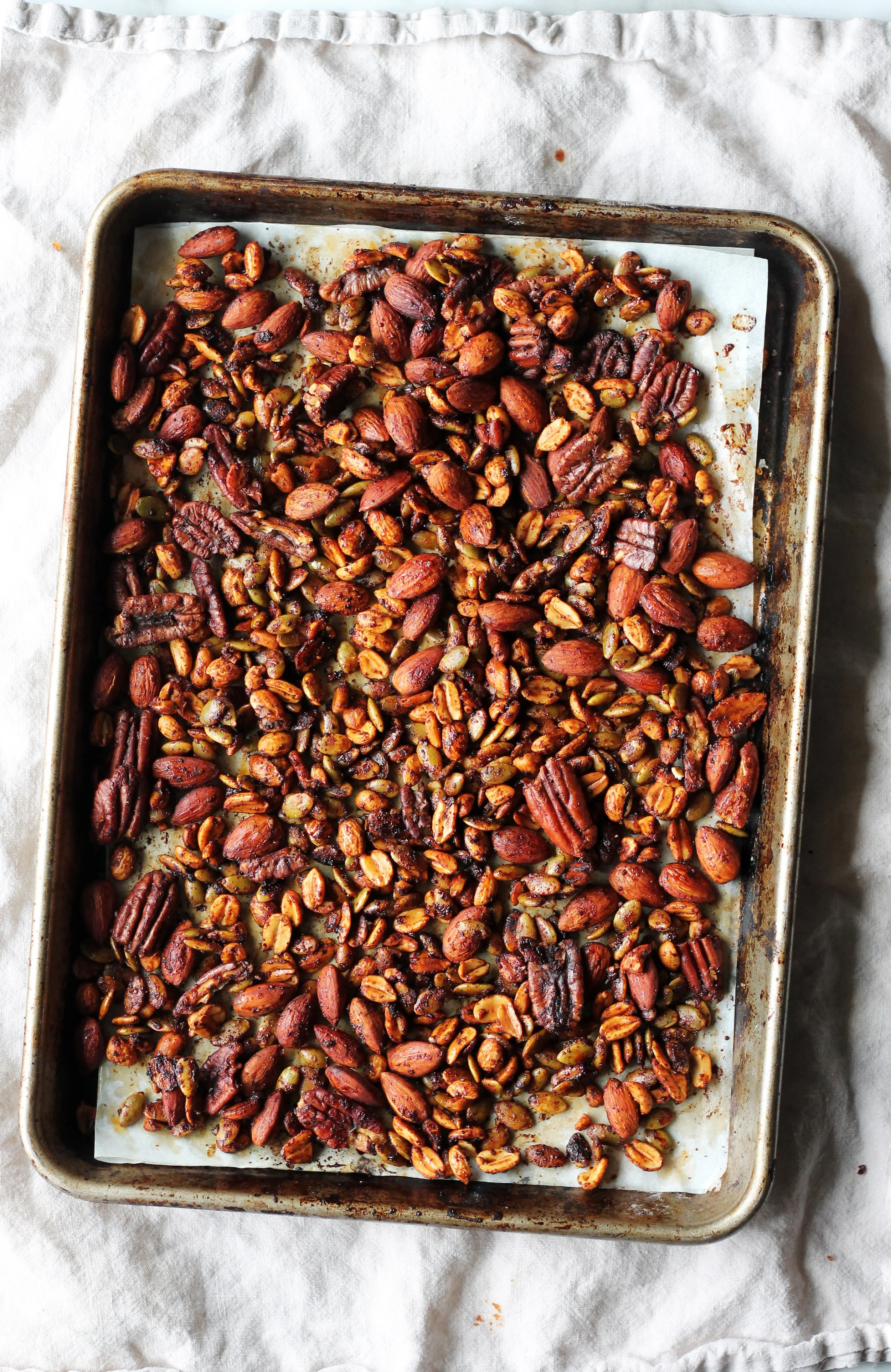 In a small bowl, whisk together the spices, oil, syrup, vanilla, and soy sauce. Pour the sauce over the nuts and mix thoroughly until everything is well-coated. You can use a spoon for this, but your hands work the best! Spread the nuts so they are in a single layer.